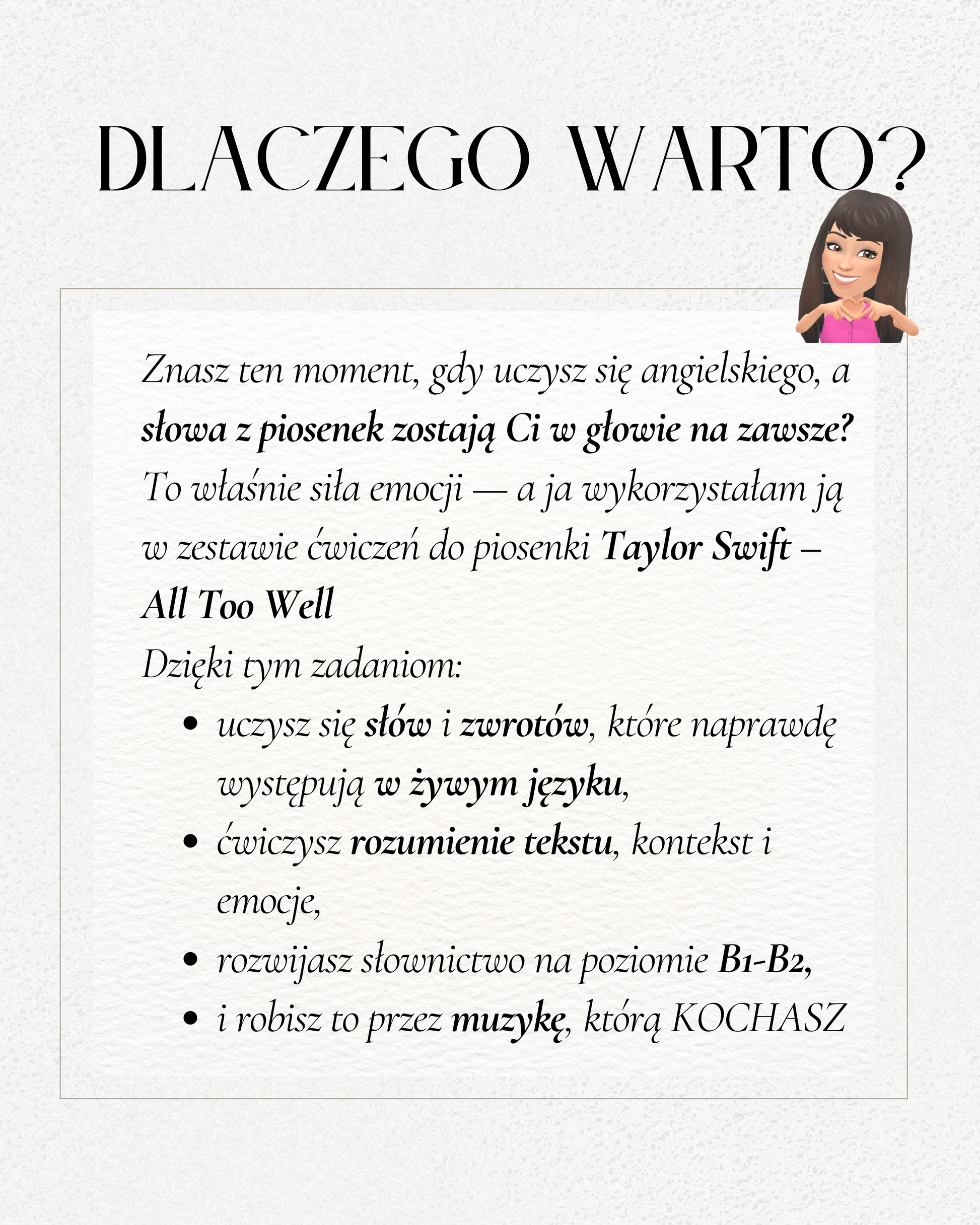 • Tematyka piosenki pozwala uczyć się języka przez emocje i kulturę