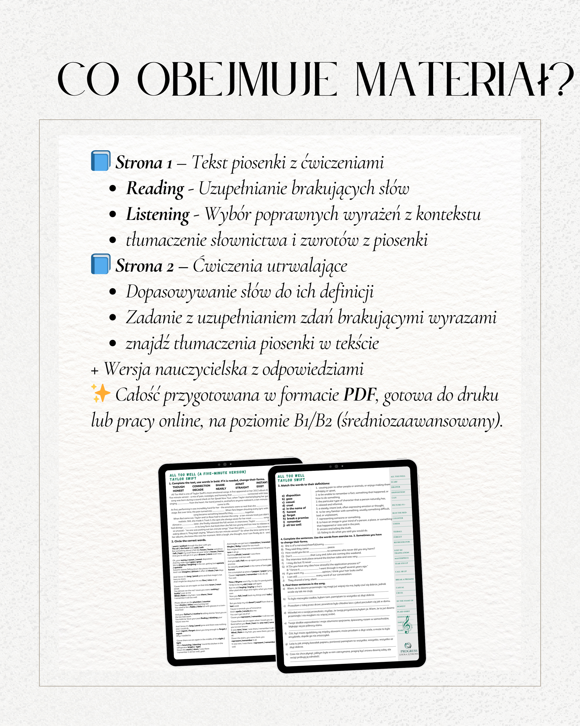 Zestaw ćwiczeń do piosenki Taylor Swift – All Too Well to gotowy materiał dydaktyczny dla uczniów, nauczycieli i wszystkich, którzy chcą uczyć się języka w naturalny, przyjemny sposób.