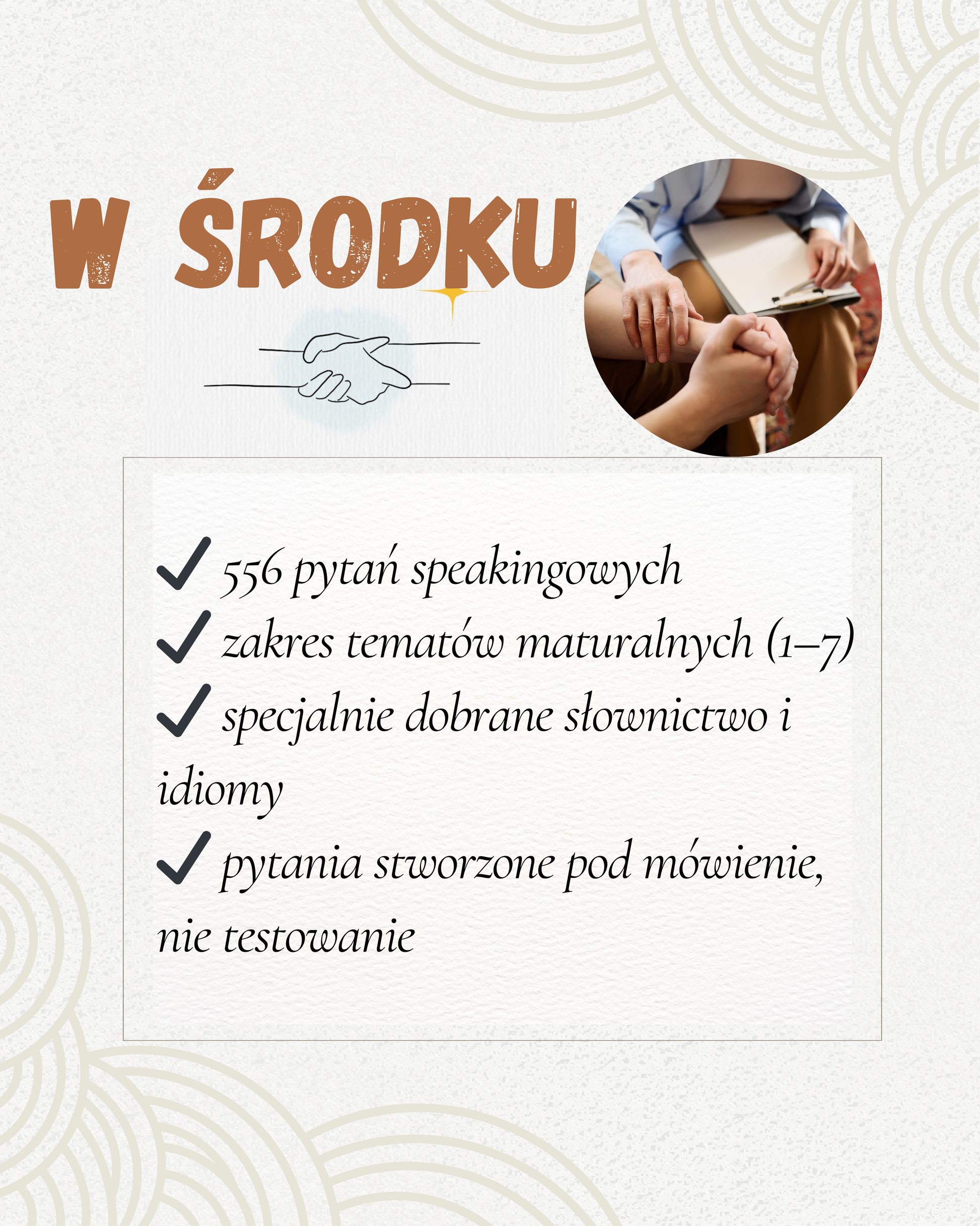 ✔️ 556 pytań speakingowych. podzielonych na 7 działów tematycznych (człowiek, dom, szkoła, praca, rodzina i relacje, jedzenie i zakupy)