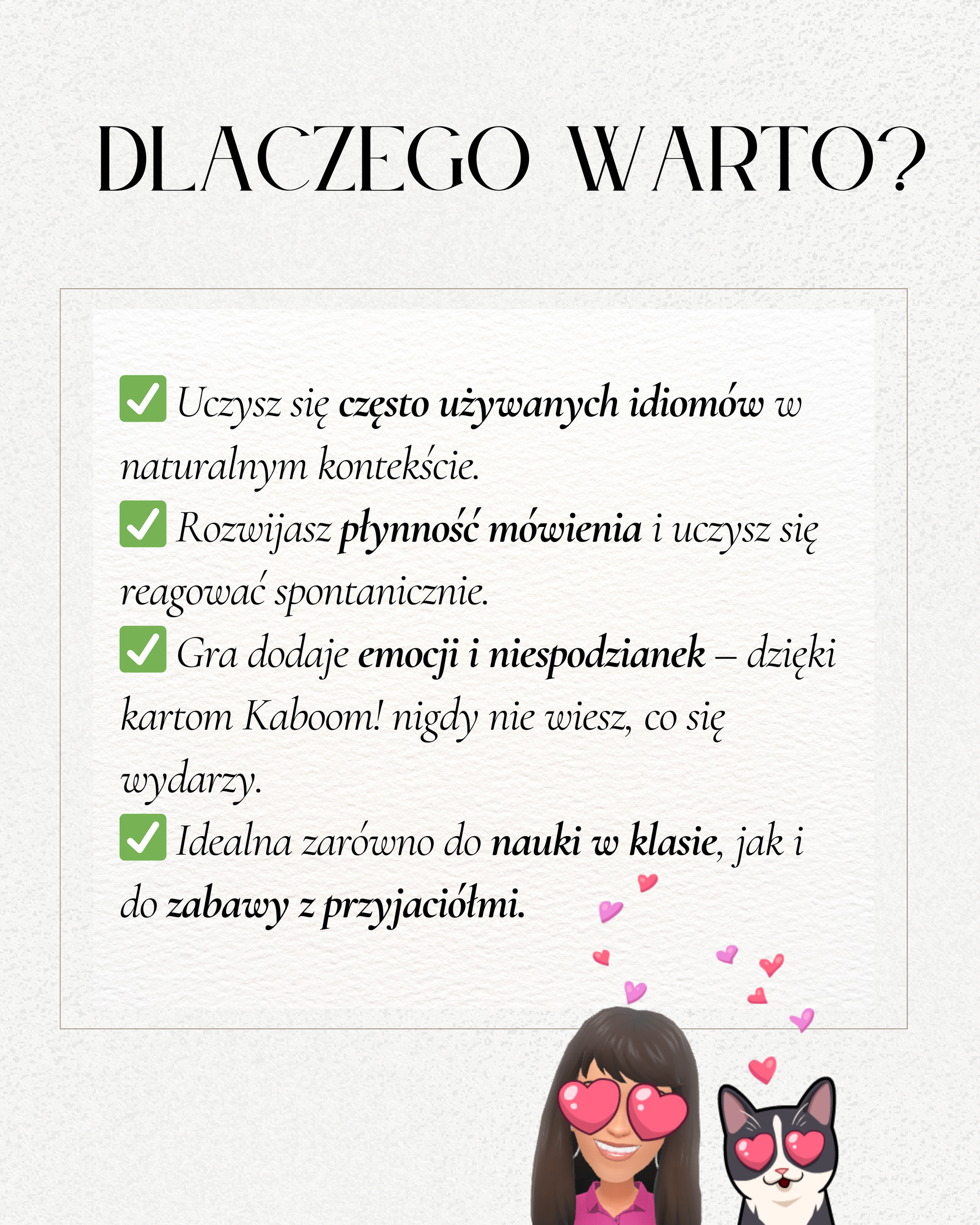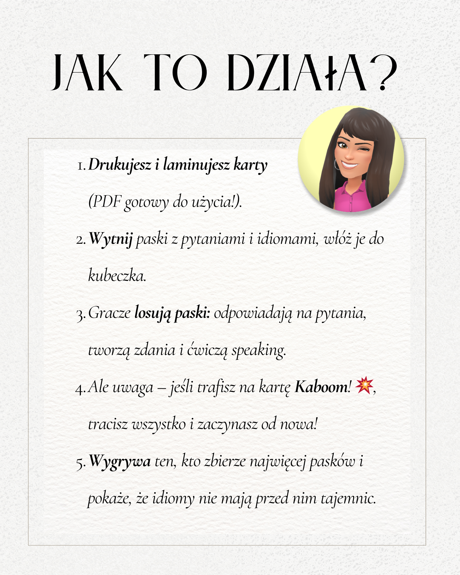 „Kaboom Idioms Challenge” to nie tylko gra – to Twoja przepustka do swobodnego mówienia po angielsku. Ucz się, baw i wygrywaj! Pobierz teraz i sprawdź, kto w Twojej grupie ma najwięcej językowej odwagi!