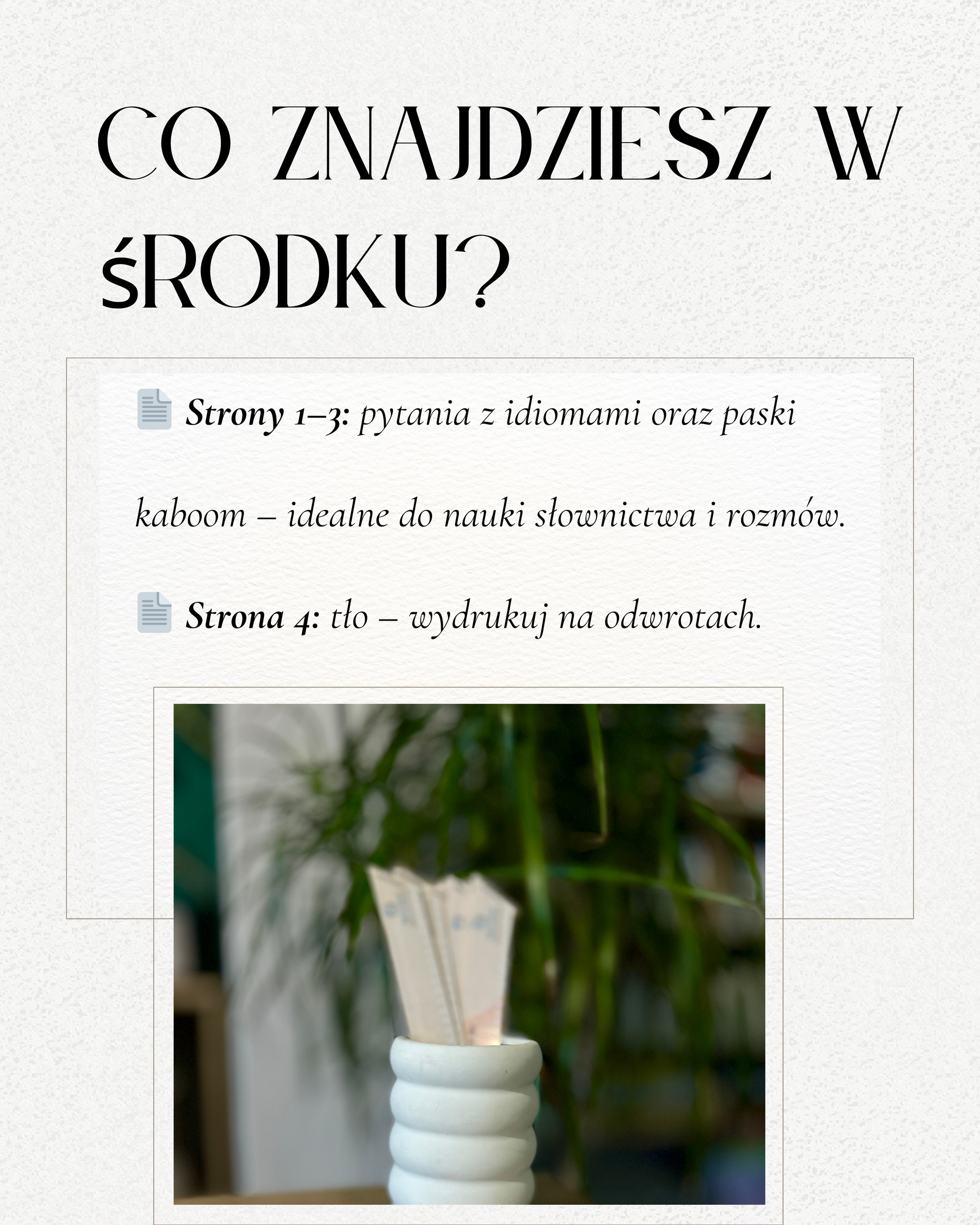 📄 Strony 1–3: pytania z idiomami oraz paski kaboom – idealne do nauki słownictwa i rozmów.