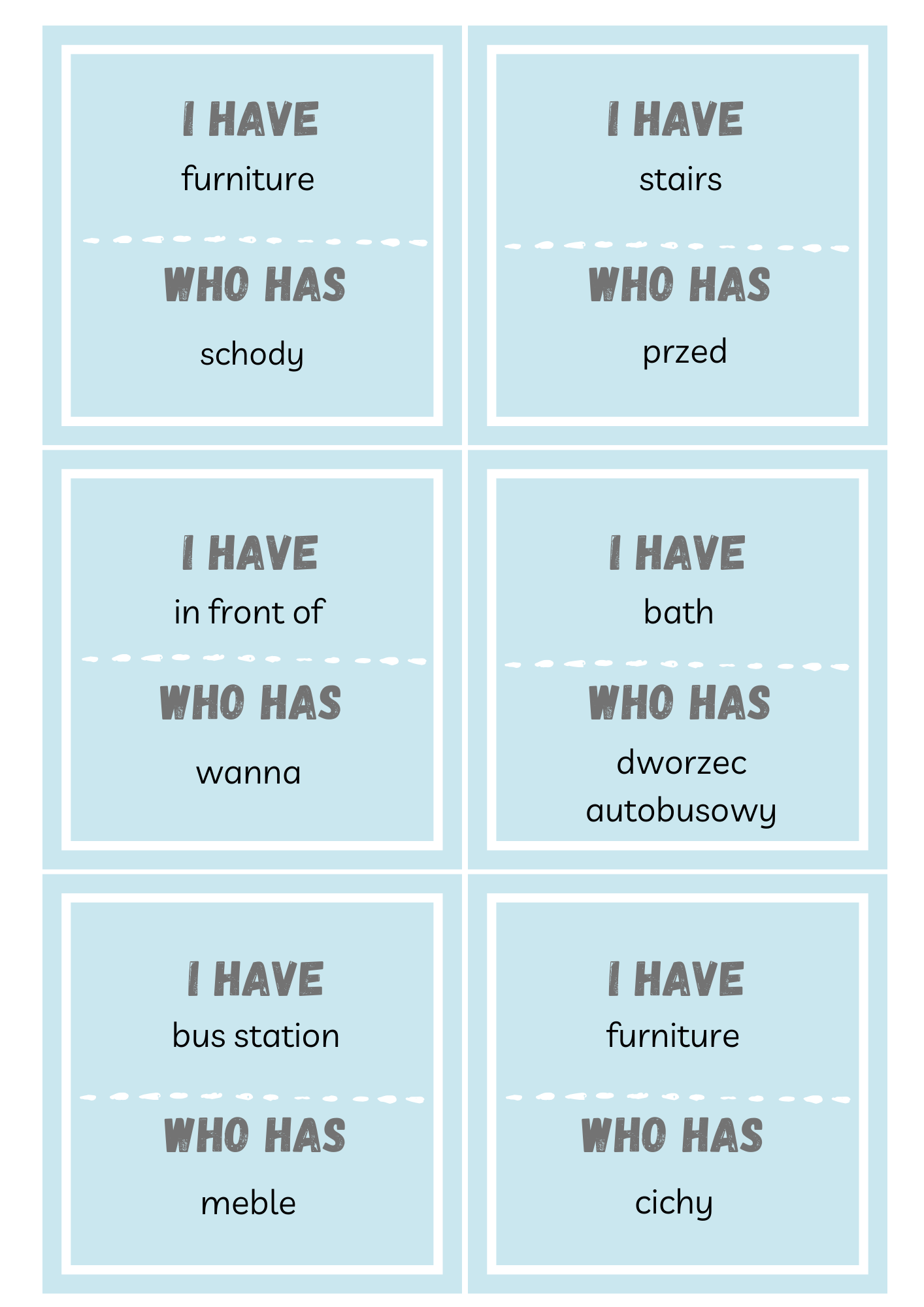 Podczas tej emocjonującej rozgrywki każdy z graczy otrzymuje zestaw kart z polsko-angielskimi tłumaczeniami wyrazów związanych z domem i różnymi miejscami. Celem gry jest pozbycie się wszystkich kart poprzez sprytne i szybkie tłumaczenie. Gra zaczyna się od uczestnika posiadającego kartę startową, który czyta swoje tłumaczenie, na przykład "I have...", a następnie zwraca się do kolegi pytaniem "Who has...?". Następna osoba podnosi rękę, prezentując tłumaczenie swojej karty, co tworzy dynamiczną interakcję wśród uczestników.