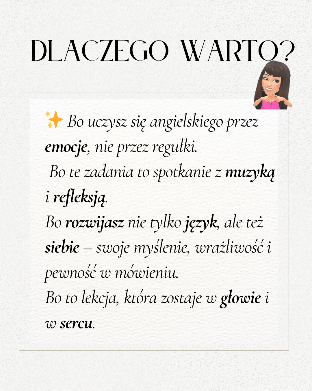 ✨ Bo uczysz się języka z sensem – przez emocje, muzykę i prawdziwe przesłania.