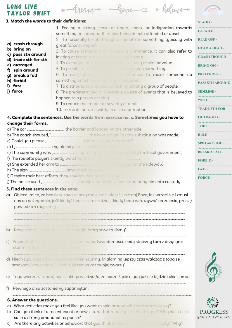 Zadania do Piosenki Taylor Swift - Long Live to doskonała propozycja dla nauczycieli oraz uczniów poszukujących kreatywnych metod nauki angielskiego. Zadania rozwijają umiejętności językowe uczniów w sposób angażujący i przyjemny.