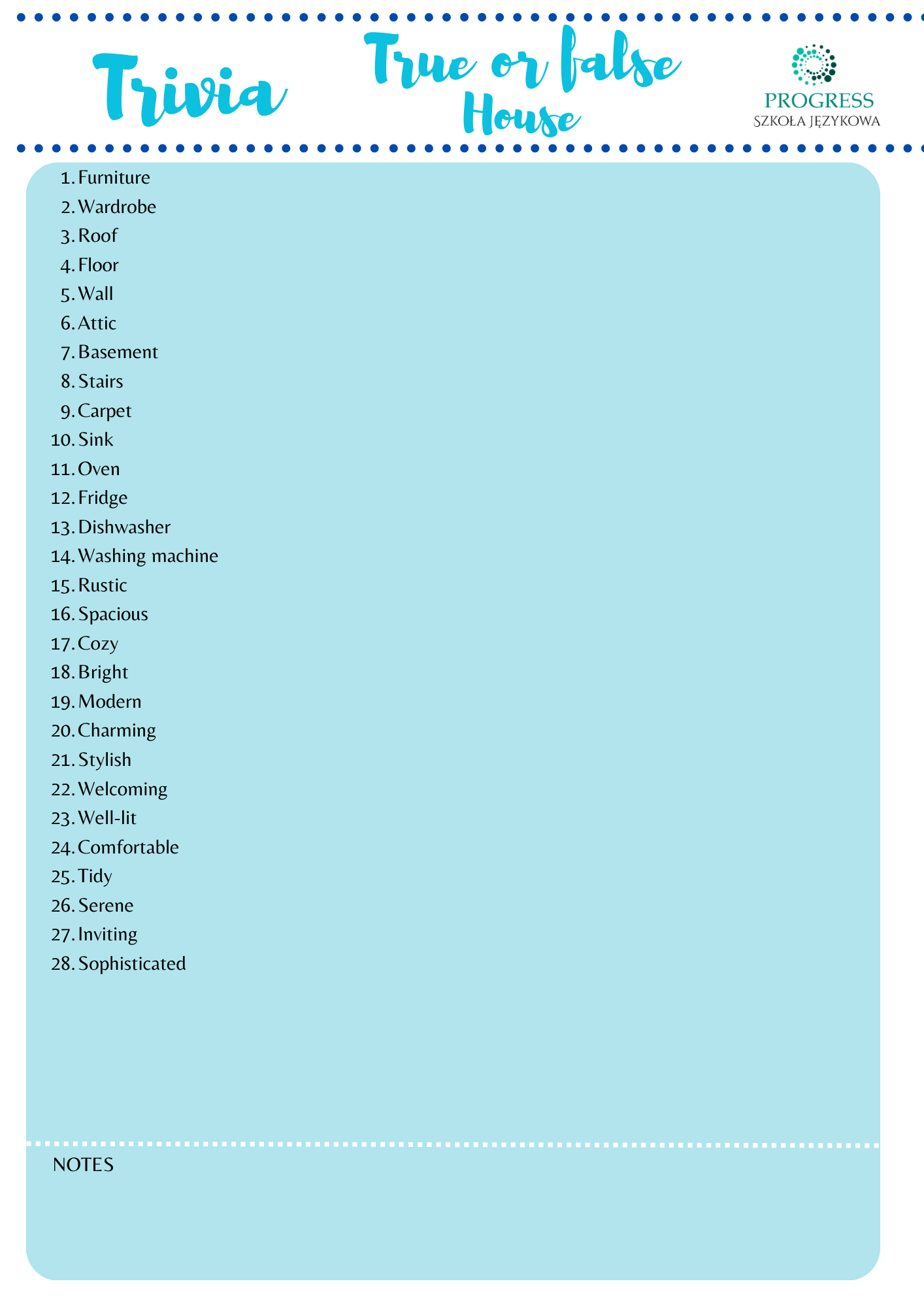 Zestaw 28 kart z definicjami słów związanych z domem, ale również specjalny worksheet dla każdego uczestnika. Pierwsza strona zawiera same wyrazy do przetłumaczenia, druga strona to identyczne definicje, jakie znajdziesz w grze. To Twoje narzędzie do utrwalania słownictwa w domu!