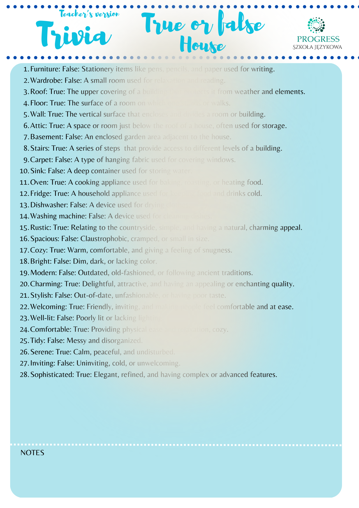 Ale to jeszcze nie wszystko! Dla nauczycieli przygotowaliśmy specjalną wersję worksheet, aby ułatwić proces nauki. Bądź kreatywny w prowadzeniu lekcji, korzystając z dedykowanych materiałów edukacyjnych. Rozwijaj umiejętności językowe w emocjonujący sposób i ciesz się efektami, gdy uczniowie opanują słownictwo na poziomie A2+/B1. Trivia House - gra, która uczyni naukę języka angielskiego przyjemną i skuteczną!