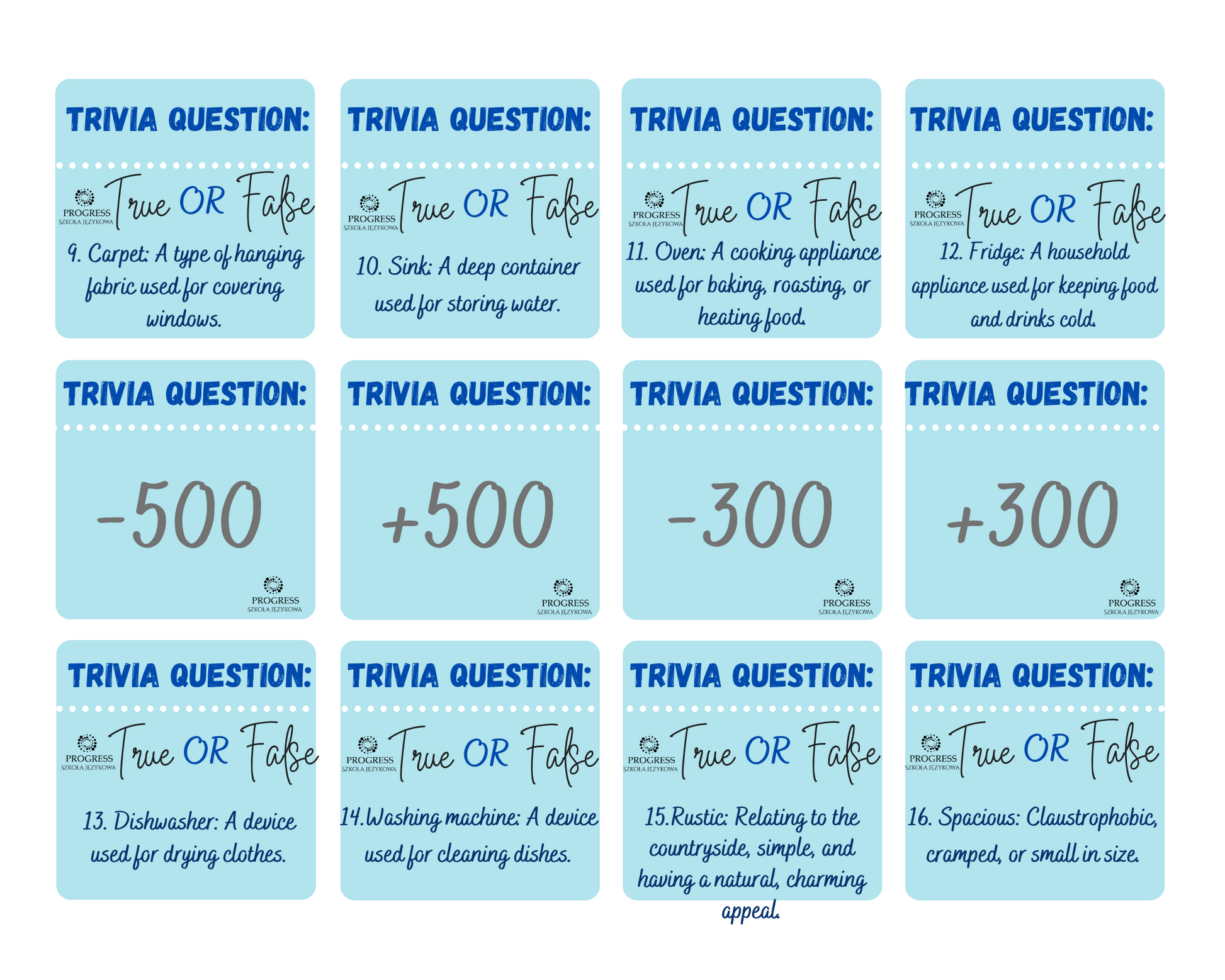 Zadaniem uczniów jest odgadnąć, czy definicje są prawdziwe czy fałszywe. Prawdziwa zabawa rozpoczyna się , gdy ryzykujesz losując karty, ponieważ znajdują się tutaj również karty +100, -100, +200 itp. Każda poprawna odpowiedź to dodatkowe punkty, ale uwaga, możesz trafić na bonusy (+100, +200, +300, +500) i kary(-100, -200, -300, -500)!